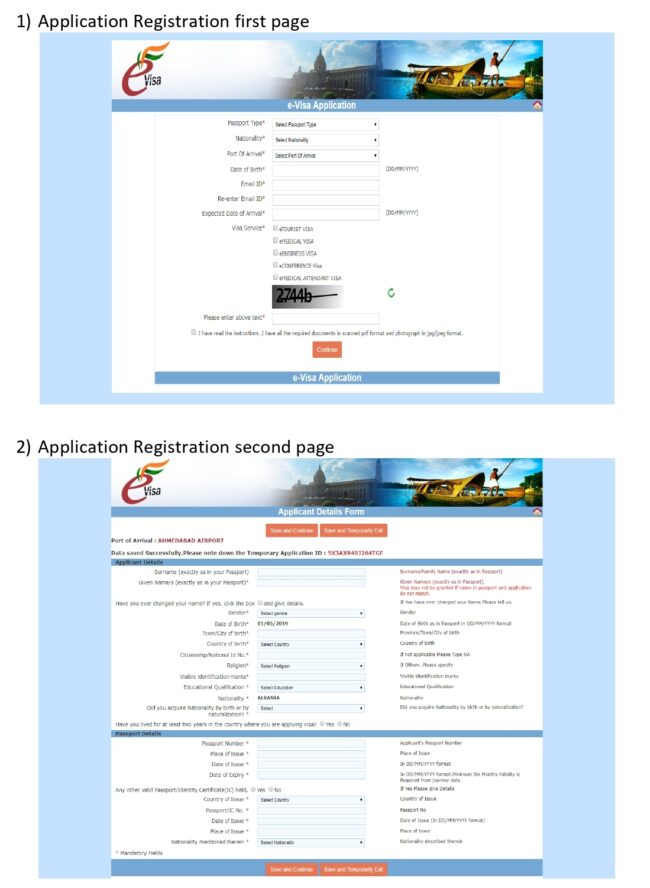 Con la e-Visa SÓLO se permite ingresar al país por alguno de los siguientes 26 aeropuertos: Ahmedabad, Amritsar, Bagdogra, Bengaluru (Bangalore), Calicut, Chennai, Chandigarh, Cochin, Coimbatore, Delhi, Gaya, Goa, Guwahati, Hyderabad, Jaipur, Calcuta, Lucknow, Madurai, Mangalore, Mumbai, Nagpur, Port Blair (Andaman), Pune, Tiruchirapalli, Trivandrum, Varanasi y Visakhapatnam. O por los siguientes 5 puertos de mar: Cochin, Goa, Mangalore, Mumbai y Chennai.