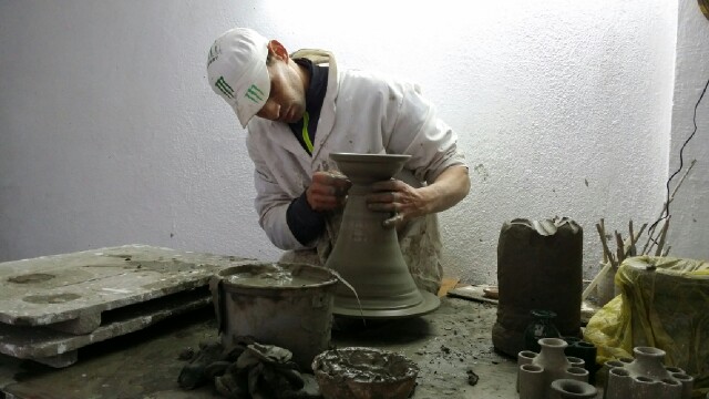 Nada más bajar del coche, los saludos, el ofrecimiento de un té y la pregunta de si queríamos ver el proceso de producción; que, en realidad, era a lo que íbamos. Bajamos dos pisos y allí encontramos los talleres con artesanos dedicados cada uno a una parte del proceso de creación: el modelado, el cocido, la pintura, etc. Es hipnotizador ver a los artesanos, pintando, modelando, aplicando el estaño, aunque lo que a mí se me pasaba por la cabeza realmente era saber cuántas horas deben trabajar al día y cuánto cobrarán por ello.