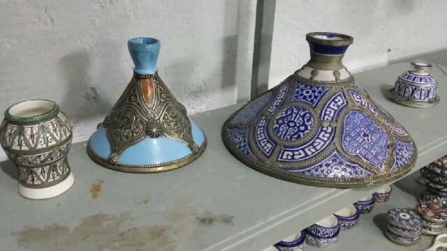 Bueno, lo has explicado de maravilla, todo el proceso de elaboración de estas fantásticas piezas al dedillo. Yo me compré un plato para la pared, grande, en blanco y azul, muy bonito y cuencos como souvenirs para regalar a los amigos, pero ya cuando nos íbamos vi un tagine hermosísimo, en azul cobalto liso, sin dibujos, pero realzado con una filigrana que yo creí de alpaca que es una belleza, aunque ahora que dices que es estaño, puede que lo sea. Pregunté el precio por preguntar, porque creí que sería carísimo, pero de los 50€ iniciales (lo digo al cambio) en menos de 5 minutos acabaron en 20 (se nota que tenían ganas de venderlo), así que me lo tuve que llevar, jeje y ahora lo tengo en la meseta del oficce de mi cocina, que es muy grande, como pieza de adorno principal y luce que ni te cuento. Parecidos, en el mismo estilo, que los tagines de tus fotos, de lo que llevan estaño, tengo un tibor que había comprado en Túnez, en Sidi Bou Said, pero me da que fue elaborado en Marruecos y no en Túnez, porque es del estilo típico de Fez, pero yo estuve en Túnez un año antes que en Marruecos, así que entonces no lo sabía. Es también muy bonito, pero ése ya me salió por más de 50€ y eso que no es muy grande. En Fez interesa comprar, porque no es caro y tienen maravillas, tus fotos bien que lo ilustran, querida Macarena.
