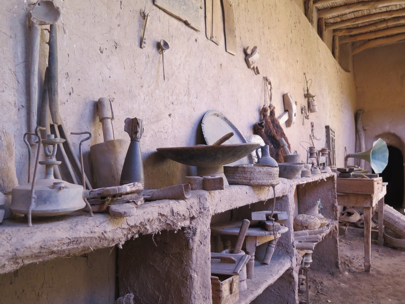 Los techos solían ser de ramas sobre vigas de madera, algunas de las cuales, como en Amridil, se conservan hasta la actualidad. El suelo era de tierra y las puertas de madera tosca a menudo con ingeniosos candados dada la naturaleza defensiva de las edificaciones. Por otra parte, llama la atención la oscuridad de los interiores y el pequeño tamaño de las ventanas –mushrabiyyas-, cuyo objetivo era doble: por una parte, poder ver el mundo exterior sin ser observado; y por otro, mantener el ambiente fresco cuando las temperaturas desérticas ascienden hasta por encima de los 50º.