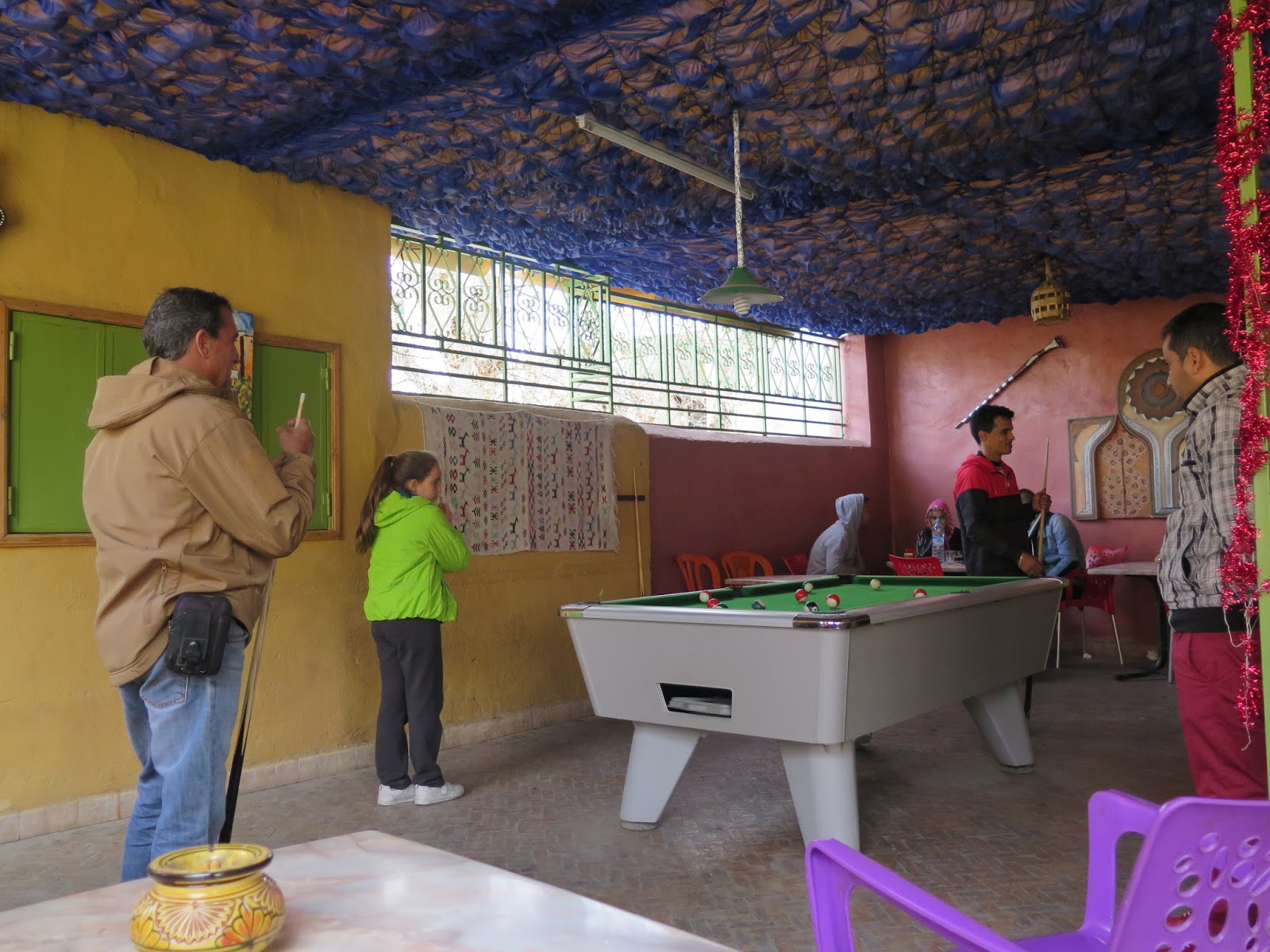 Pedimos nuestras coca colas y nuestro botellín de agua y subimos. Como ciertamente estábamos tranquilos, Macarena le propuso a su padre jugar una partidita de billar y aquello fue el detonante que hizo que propiciáramos una mañana de ventas sin precedentes en aquel lugar. La terraza de arriba comenzó a llenarse de señoritas rubias que fumaban y señores sin dientes que fumaban más todavía. Todos querían hacer equipo y jugar un Marruecos-España. Comenzaron las conversaciones pacíficas sobre el fútbol, que si de dónde sois, que si qué bien, que si … todo bastante sorprendente, la verdad; pues jamás me hubiera pensado que estaríamos tan cómodos en un lugar tan sórdido del que al principio quise salir huyendo.