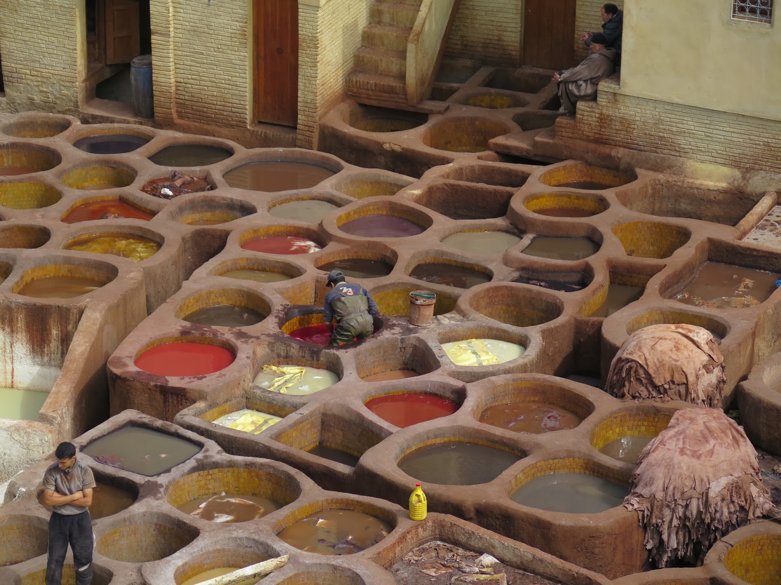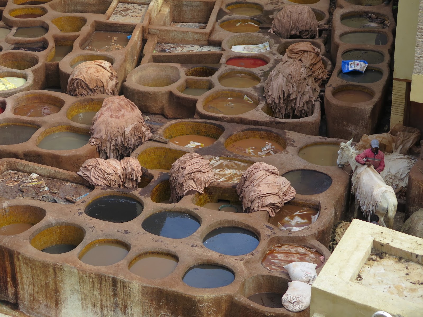 Las pieles más apreciadas por los artesanos curtidores de Marruecos son las de camello y cabra, considerándose la de vaca y oveja de menor calidad. En primer lugar, se empapan en cal para quitarles el pelo rascando. Esta lana, que se considera muerta, se utiliza para rellenos de almohadas y cojines. Posteriormente, se sumergen las pieles durante un periodo que va de una semana a un mes en agua, caca de paloma y pipí de vaca para que se ablanden. Lo que convierte las pieles en tejidos suaves y flexibles para poder ser trabajados; y estas mezclas de química natural son las responsables del mal olor en estos lugares. Por último, se tiñen las pieles con productos naturales como azafrán, flor de amapola, etc.