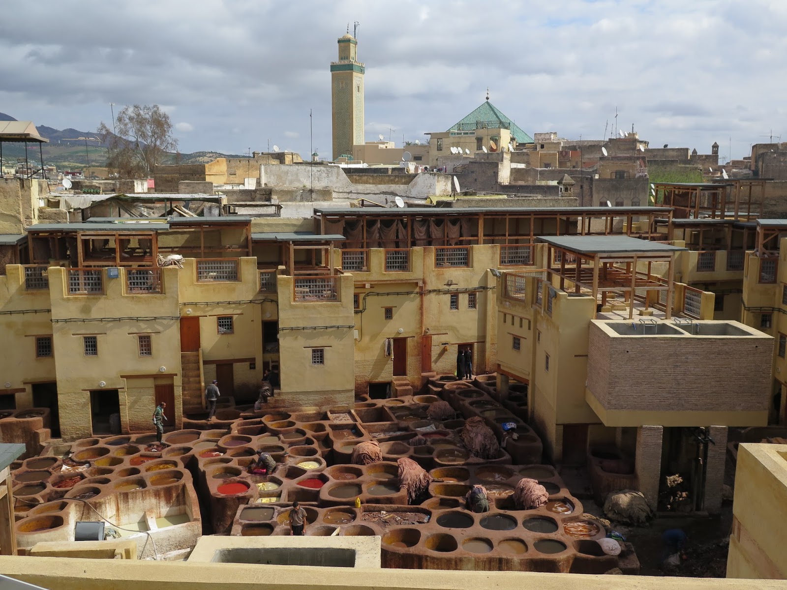 En la medina de Fez hay dos tenerías –zoco de los curtidores-. La más grande es la de Derb Chouwara, y hay otra de menor tamaño cerca de la Plaza Nejjarine. Pese al olor pútrido que se respira en cualquiera de ellas, fruto de los materiales con los que descomponen el pelaje y ablandan las pieles, sin dudarlo nos quedamos con la primera de ambas; pero esta vez resultó que la tenería Chouwara estaba cerrada por restauración, así que la señora gorda nos llevó hasta la más pequeña, que era también válida para que Macarena –que ya no se acordaba- se quedara boquiabierta observando aquel proceso de curtido y tintado que data de siglos.