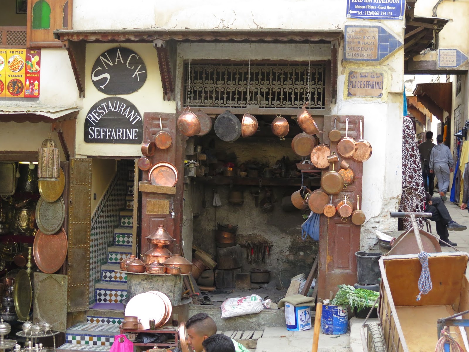 Esta zona no se visita necesariamente en este orden y menos aún nosotros que siempre hacemos una parte del revés. Encontramos una señora gorda que se ofreció a llevarnos a las tenerías. Por lo general, en Marruecos no hay que fiarse de los “bondadosos acompañantes”, en el caso de las mujeres suele ser diferente y aquí en Fez más, porque de cerrarse de manera exitosa una buena compra, la mujer se llevaría una buena comisión y conocíamos que éste era el único interés que la guiaba.