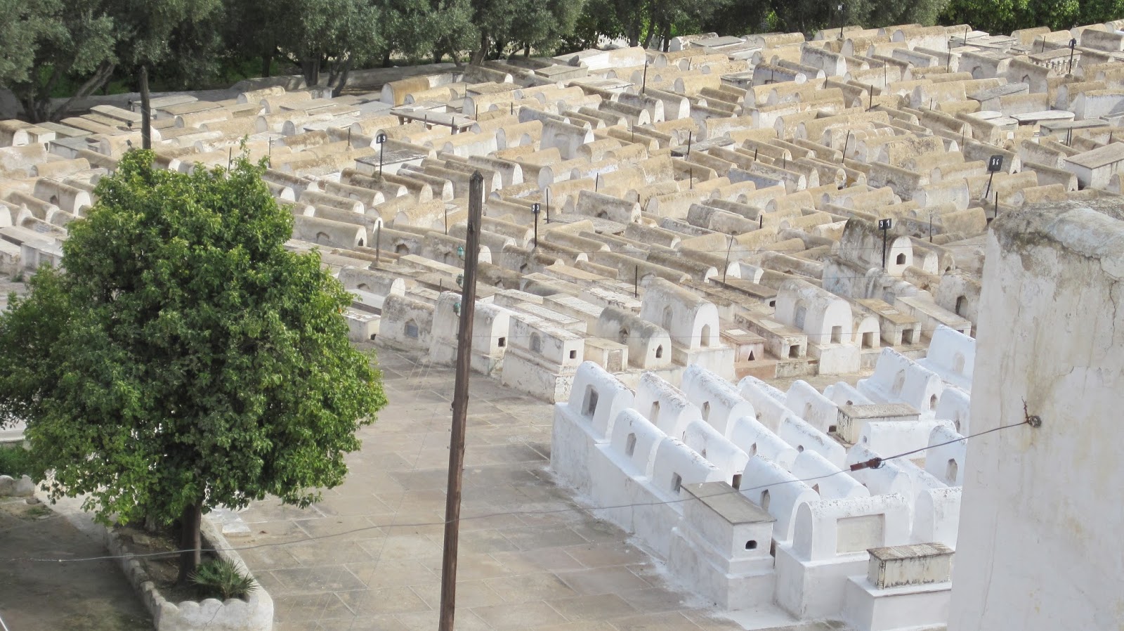 La visita terminaba con el ofrecimiento de subir a la terraza a contemplar el cementerio judío, previo pago de un estipendio. Y como el cementerio judío de Fez no es de los más bellos de Marruecos, accedimos para verlo desde una perspectiva diferente en lugar de dar un rodeo hasta él. Pero cuál fue mi sorpresa, al acceder a la parte superior de la sinangoga, que encontramos un gran tendedero de bragas y calzoncillos sobre los bancos ¡Madre mía! En fin… cosas de Marruecos.