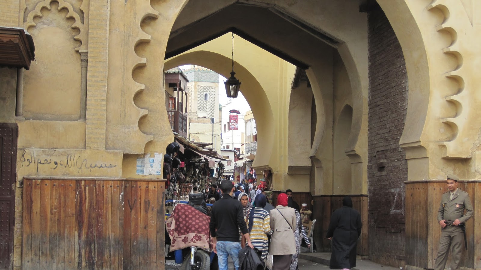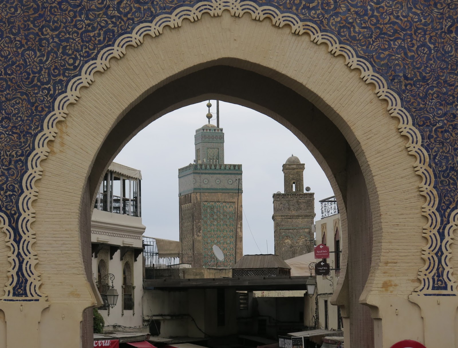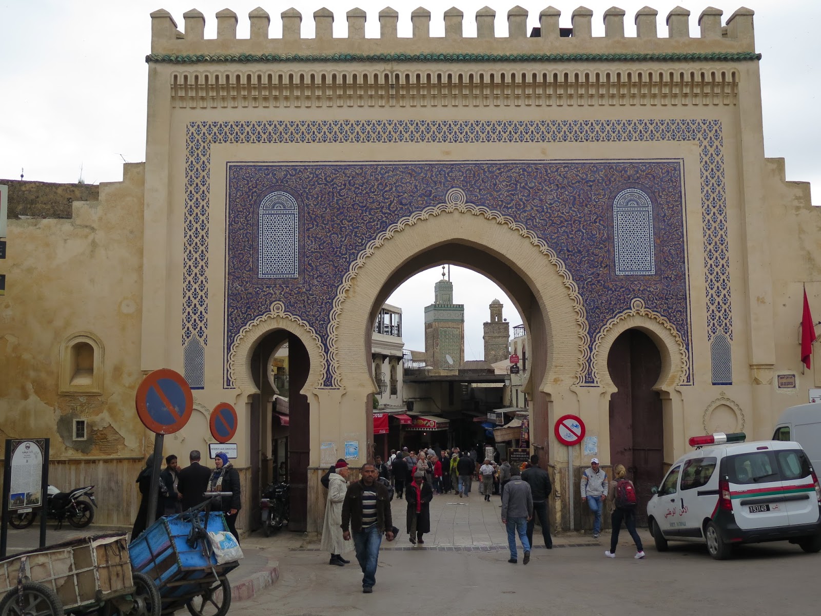 Lo mejor es comenzar por la puerta Bab Boujelud. Esta entrada a la ciudad es una de las más modernas, con tan sólo un siglo de existencia, pero se trata de un lugar emblemático por ser punto de partida para la visita a la medina. Cubierta de baldosas de cerámica azules en su parte externa y, verdes en su interior, lo que se atisba a través de su arco da ya una idea de las maravillas que esperan al visitante: el minarete de la izquierda, de color verde, es parte de la medersa Bou Inania, y el minarete gris de la derecha, forma parte de la mezquita Sidi Lazaz.