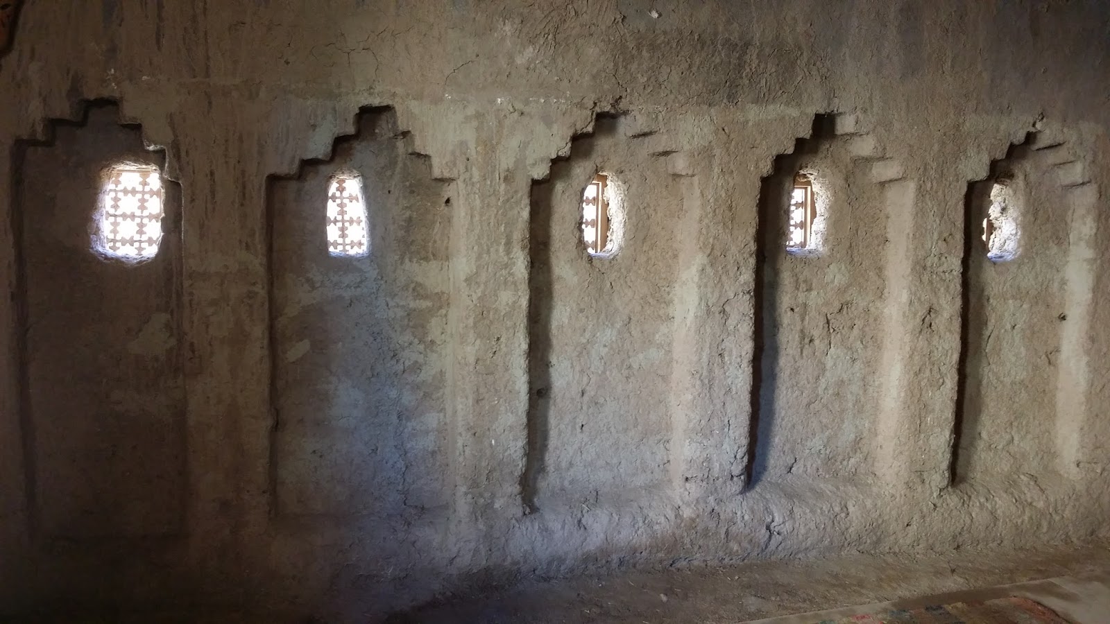 La parte superior, a la que se accede por oscuros pasillos y una rudimentaria escalera gastada por el paso del tiempo, aloja algunas estancias y una terraza desde la que se divisa el bello palmeral de Skoura. Desde aquí, se visita -en lugar privilegiado y separado del resto- la madrasa y mezquita privada -en cada kasbah importante vivía de manera permanente un imán que oficiaba los rezos y enseñaba a los niños- y la habitación de la esposa favorita – la madre del primogénito del señor del clan-.
