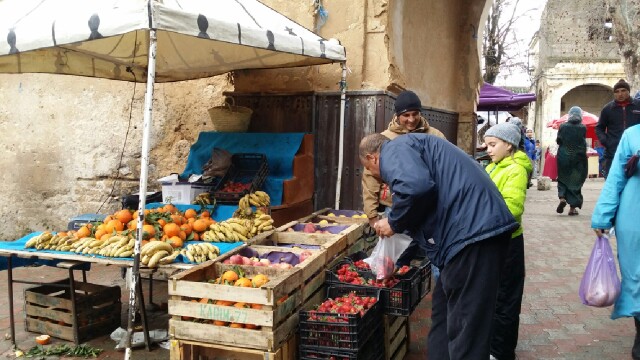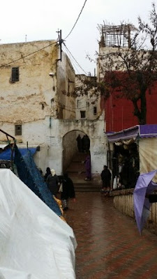 Aparcamos en la amplia avenida justo enfrente de la puerta Bab el-Maqam, bajo una fina y persistente lluvia. Pronto apareció el típico guía, al que agradecimos que no nos acompañara, y nos adentramos en las estrellas callejuelas enfangadas del interior de la medina para observar de cerca el continuo ir y venir de hombres entre los puestos de pescado, verduras y carne.