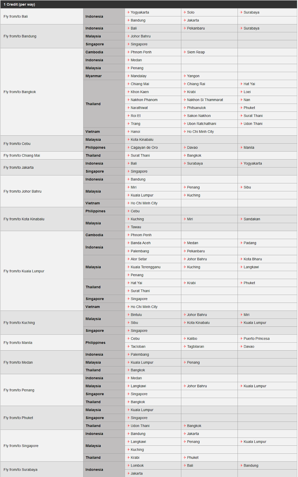 Cada trayecto vale 1 ó 3 puntos, dependiendo del coste, los vuelos y la frecuencia. En la página de Airasia hay unas tablas con las equivalencias en puntos de cada uno de los trayecto que deberán ser diferentes, ya que no está permitido canjear los puntos para realizar el mismo trayecto más de una vez.