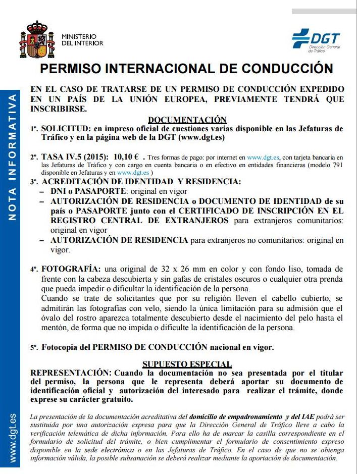 Toda la información, así cómo los impresos pueden obtenerse en la siguiente dirección https://sede.dgt.gob.es/es/tramites-y-multas/permiso-de-conduccion/permiso-internacional/, más para el trámite final, consistente en la entrega de la documentación y la expedición del permiso, deberá acudirse a la oficina de la DGT.